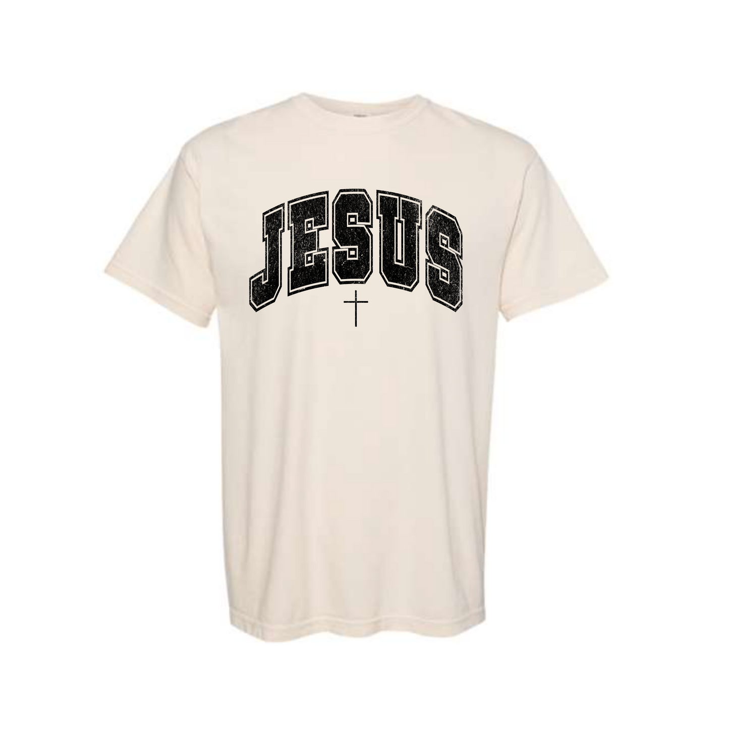 This varsity lettering Jesus tee is a stylish and versatile addition to any wardrobe. With high-quality materials and expert construction, it provides comfort and durability for all-day wear. Show your faith in a subtle yet sophisticated way.