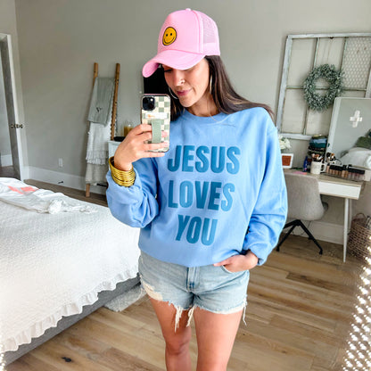 Join the trend with our new JESUS LOVES YOU DENIM PUFF SWEAT-SHRIT! Show off your faith and style with this quirky top. Don't miss out on this fun addition to your wardrobe. Grab one today!